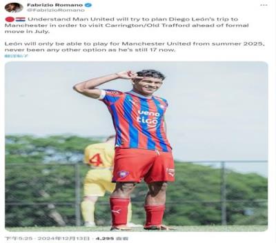 体育资讯12月13日报道宣称 据知名记者罗马诺透露,曼联计划让迭戈-莱昂参观俱乐部。
