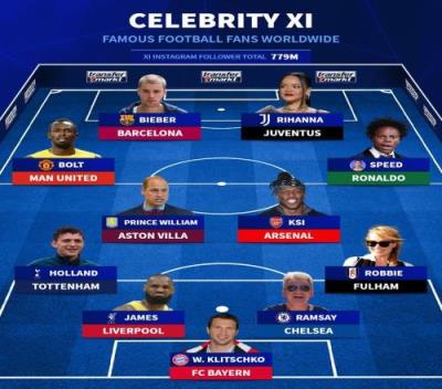 前锋:博尔特(牙买加短跑运动员,曼联)、贾斯汀-比伯(加拿大歌星,巴萨)、蕾哈娜(巴巴多斯歌星,尤文)、Speed(美国网红,C罗)