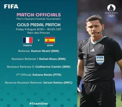 体育资讯8月9日报道宣 北京时间明天0时,奥运男足决赛法国U23vs西班牙U23,本场裁判组已公布,34岁的巴西裁判拉蒙-阿巴蒂担任主裁判。