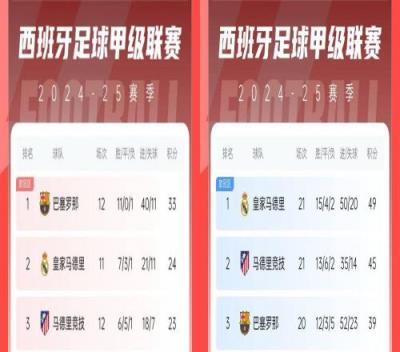 本赛季西甲前12轮,巴萨11胜1负领跑,狂取33分仅丢3分,皇马第12轮延期少赛1场,落后巴萨9分。