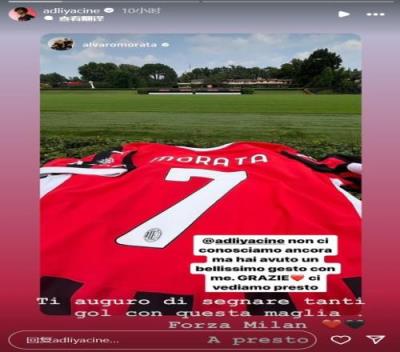 在加盟米兰后,莫拉塔更新社媒感谢了阿德利:“@阿德利:我们还不认识,但你为我做出了一个漂亮的举动。谢谢❤️‍很快见。”