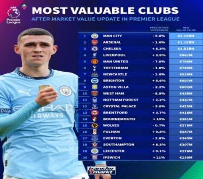 体育资讯12月17日报道宣称 德转更新了英超球员身价,并列出最新英超球队身价榜,其中曼城仍居榜首,阿森纳次席,以下为具体榜单:
