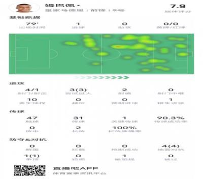 姆巴佩本场比赛具体数据如下: