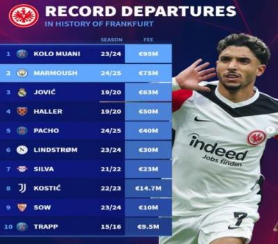 体育资讯1月23日报道宣称 曼城已经官宣签下法兰克福前锋马尔穆什,《转会市场》也列出了法兰克福队史卖人榜情况。
