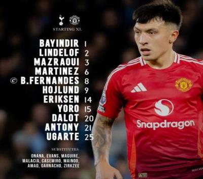 曼联首发:1-巴因迪尔、2-林德洛夫、15-约罗、6-利桑德罗-马丁内斯、3-马兹拉维、25-乌加特、8-B费、14-埃里克森、20-达洛特、21-安东尼、9-霍伊伦