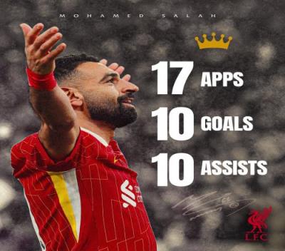 据统计,萨拉赫本赛季在各项赛事中17场10球10助,他也成为了本赛季五大联赛首位进球和助攻数均上双的球员。
