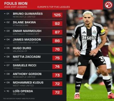 体育资讯1月2日报道宣称 数据统计了本赛季目前欧洲五大联赛被犯规次数排行榜,纽卡的吉马良斯125次居首。