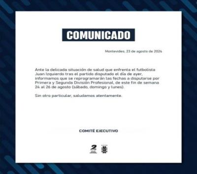 现在乌拉圭联赛官方发文表示:“由于伊斯奎耶多在昨天的比赛后健康状况不佳,甲级和乙级联赛本周末(8月24日至26日)的比赛将改期进行。”