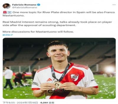 体育资讯7月18日报道宣称 据知名记者罗马诺的消息,皇马仍对河床16岁中场马斯坦托诺感兴趣,已与球员展开谈判。