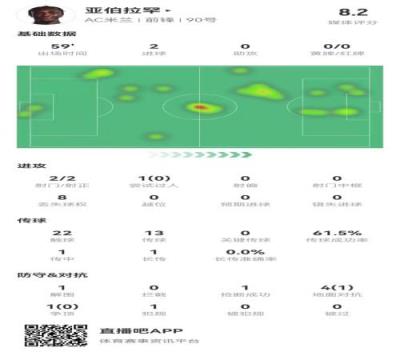 体育资讯2月6日报道宣称 米兰在本场3-1领先罗马,亚伯拉罕本场数据如下: