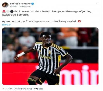 体育资讯1月20日报道宣称 据知名记者罗马诺透露,尤文19岁中场农热(Joseph Nonge Boende)接近加盟瑞士俱乐部塞尔维特。