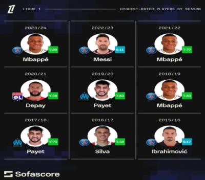 sofascore近9年法甲评分MVP:姆巴佩3登顶,梅西在列&无内马尔