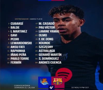 巴萨客战皇家社会大名单:莱万、亚马尔、库巴西、奥尔莫在列