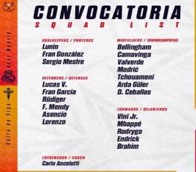 皇马公布战塞尔塔名单:库尔图瓦缺席,姆巴佩&维尼修斯领衔锋线