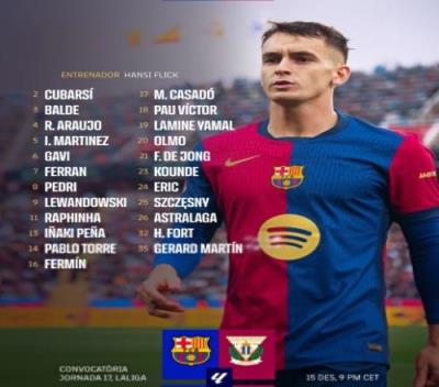 体育资讯12月15日报道宣称 北京时间12月16日凌晨4:00,2024-25赛季西甲联赛第17轮,巴塞罗那将坐镇主场迎战莱加内斯。赛前巴萨官方公布本场比赛大名单,莱万领衔锋线,阿劳霍在列,法蒂继续缺席。