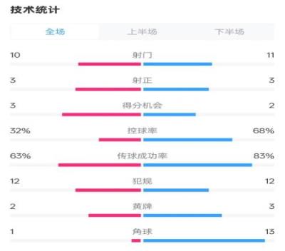 纽卡20阿森纳全场数据:射门1011,射正33,控球率32%68%