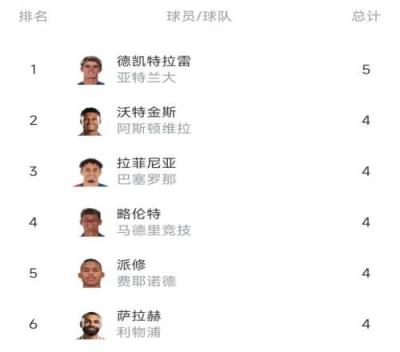 体育资讯1月30日报道宣称 欧冠联赛阶段比赛战罢,德凯特拉雷送出5记助攻,排名欧冠助攻榜首位。