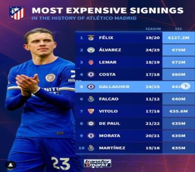 马竞引援转会费排行:菲利克斯居首小蜘蛛第2、加拉格尔第5