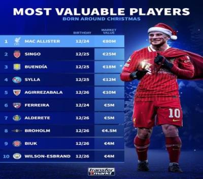 德转盘点圣诞节前后生日的球员身价:麦卡利斯特8000万欧第一
