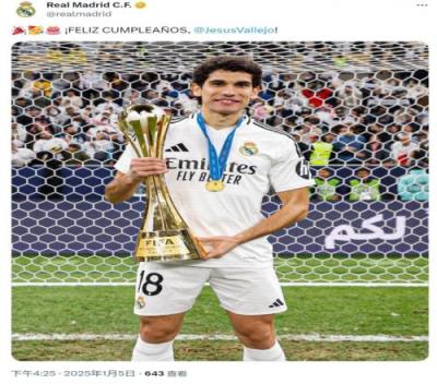 皇马官方社媒晒出巴列霍与洲际杯奖杯的合照,配文:“生日快乐,巴列霍!”