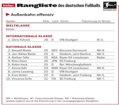 体育资讯7月27日报道宣称 德国媒体《踢球者》对上赛季德甲后半程边锋进行评级,世界级空缺,弗里希洲际级,马伦、堂安律等9名球员国脚级。