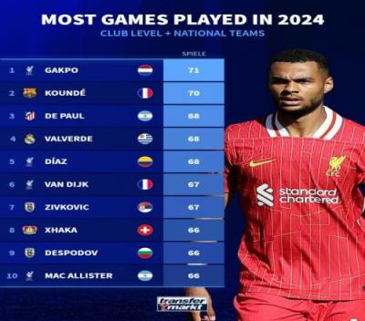 体育资讯1月3日报道宣称 德国转会市场统计了2024年球员在俱乐部和国家队参加的比赛场次,并列出榜单,加克波71场居首,孔德70场次席,前10名利物浦球员占4席。