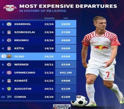 体育资讯8月9日报道宣 莱比锡中场奥尔莫已经官宣转会巴萨,《转会市场》也统计了莱比锡队史卖人榜,奥尔莫位居第5。