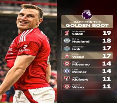 17球,伊萨克(纽卡)、克里斯-伍德(诺丁汉森林)
