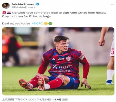 体育资讯8月20日报道宣 据知名记者罗马诺透露,诺维奇敲定克罗地亚20岁前锋安特-科纳克,转会费1100万欧元。