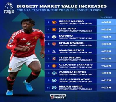 德转列2024英超U21球员身价涨幅榜:梅努上涨4600万欧居首