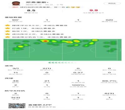 邓弗里斯本场数据:1球1助,9次对抗赢得6次,获评8.5分