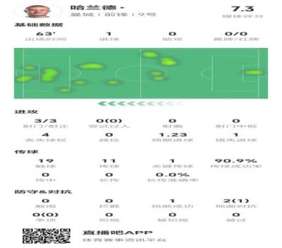 技术统计数据显示,哈兰德本场比赛有3次中目标的射门,错失1次重大机会,他有1次关键传球,最终获评7.3分。