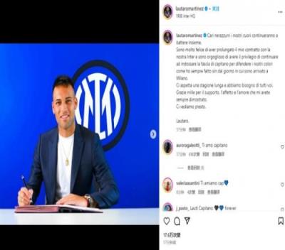 劳塔罗晒出了自己的续约照,并发文:“亲爱的内拉祖里们,我们的心将继续一起跳动。我很高兴能够和我们的国米续约,也很荣幸能够继续佩戴队长袖标捍卫我们的旗帜,正如我自加盟以来一直所做的那样。”