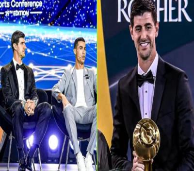 库尔图瓦指着他身边的C罗说:“我们最成功的教练罗伯托-马丁内斯现在是我身边这位的教练,在他的带领下,我们取得了非常好的成绩。但不幸的是,我们在2018年世界杯半决赛输给了法国。”