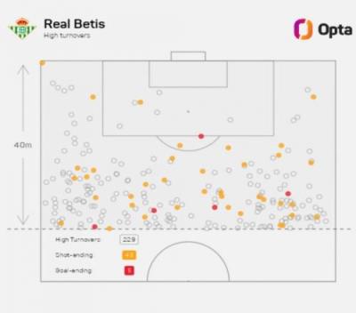 此外,在贝蒂斯发起的252次高位反击中,最终有43次成功完成射门,并取得了5粒进球。
