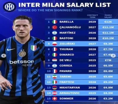 德转列国米薪资榜:巴雷拉等4人超千万欧,科雷亚650万欧第9