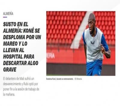 西媒:阿尔梅里亚前锋科内今天训练时晕倒,队医治疗后送院