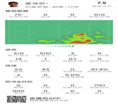 亚马尔本场数据:3射0正,5次过人均成功,7次对抗5次成功