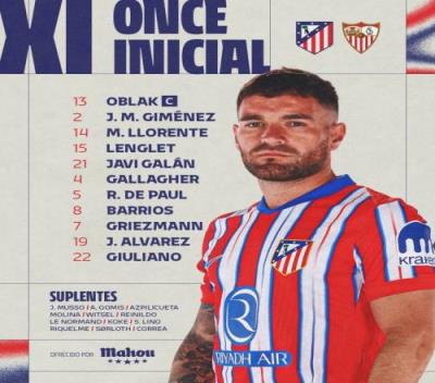 马竞主场对阵塞维利亚首发:格列兹曼搭档小蜘蛛,小西蒙尼出战