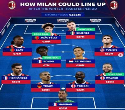 德转预测米兰补强后首发阵:总身价3.86亿欧元