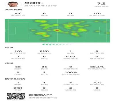 乌加特本场7对抗+2长传全成功,2造犯规+5抢断获评7.2分曼联最高