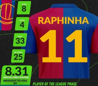 8球4助攻+25关键传球!拉菲尼亚获评whoscored欧冠小组赛最佳球员