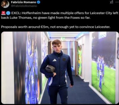 报道称霍芬海姆提出的报价在500万欧左右,还未能达到莱斯特城的期望。卢克-托马斯现年23岁,本赛季代表莱斯特城仅在英超有过2次出场。