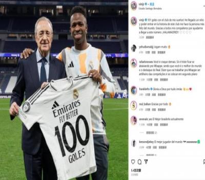 维尼修斯社媒晒照纪念百球里程碑:载入皇马史册令我无比幸福