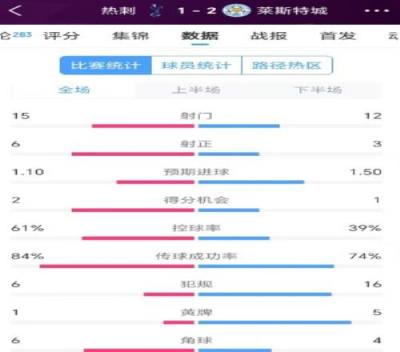 热刺12莱斯特城数据:射门数15比12,前者35次传中仅成功7次