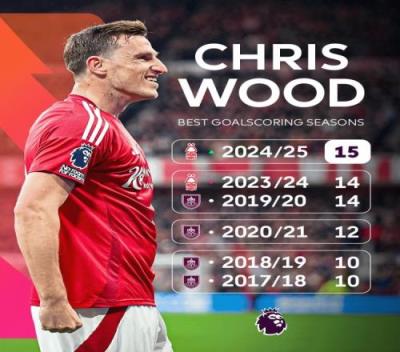 据英超官方数据统计,本赛季到目前为止,伍德已经在英超联赛中打进15粒进球,这是他进球最多的一个赛季,此前,他曾在2019-20赛季以及2023-24赛季打进14球。
