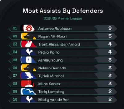 本赛季英超后卫助攻榜:罗宾逊9助居首,努里5助&阿诺德4助