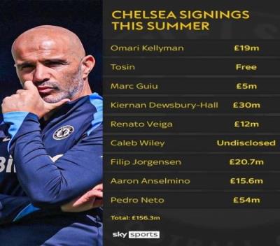 体育资讯8月13日报道宣 《天空体育》统计了切尔西今夏的引援情况,共计为9名球员花费1.563亿英镑转会费。