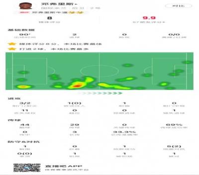 邓弗里斯全场数据:3次射门打进2球,错失1次机会,1次抢断