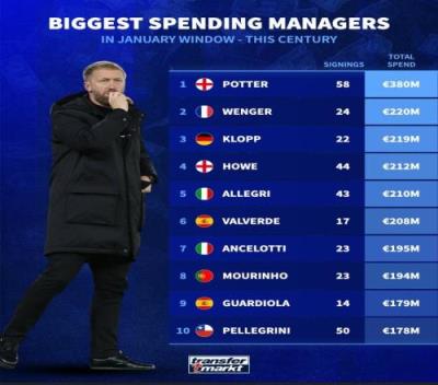 体育资讯1月16日报道宣称 德国转会市场盘点了21世纪足球主教练的冬窗引援数量,西汉姆主帅波特一共在冬窗签下过58名球员,总花费3.8亿欧元,两项数据都断层领先。